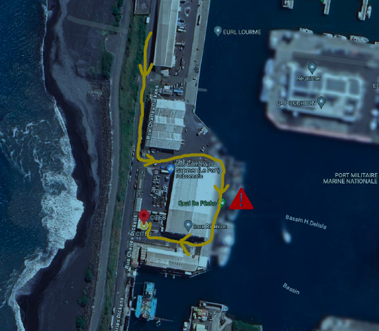 Arrivée par la rue Charles Dickens, prendre l’entrée du Grand Port à côté de la Sapmer, allez jusqu’au bord du quai, contournez le hangar 10 par le quai pour rejoindre le Citeb, roulez au pas.